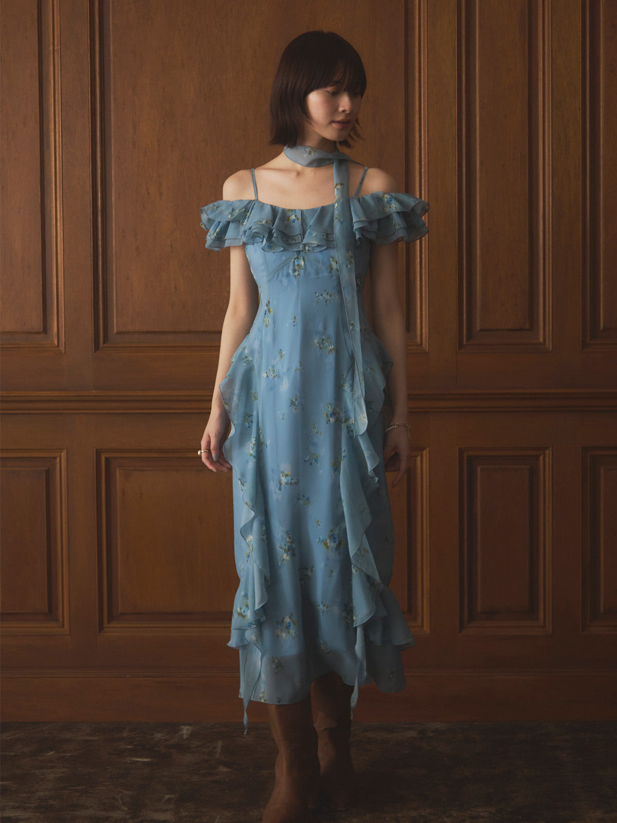 eimyistoire Margot Flower スクエアネックミニワンピース Jasmine Grandiflorumフリルスクエアネック半袖ミニワンピース